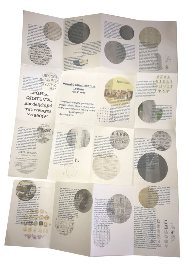 As part of the last module of my first year, I was asked to interpret information on the history of graphic design that we learned through a series of lectures throughout the year. Once I had the information, I had to narrow it down to an area of graphic design I found interesting and lay the information out using the latch theory. I chose the history of typography from 35,000BC to the present day and made connections relating from the early days of typography to the present day and explained why these connections were made, This was really engaging and helped me further my skills in how to interpret information and to lay it out in a playful but effective way. The timeline and G fold layout was a really effective way of after the information through the timeline to read all the information without getting bored.